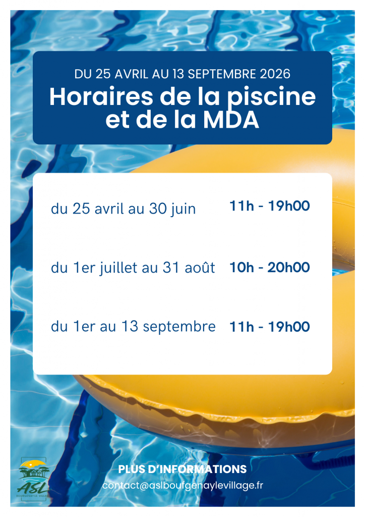 L’espace aquatique ouvrira le samedi 25 avril et de ce fait la MDA sera ouverte à partir de cette date tous les jours jusqu’au 13 septembre 2026.
