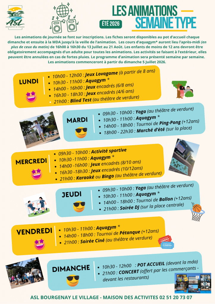 Voici une semaine type pour votre information. Les animations commenceront le dimanche 5 Juillet avec notre traditionnel Pot d’accueil (devant la maison des activités) et se termineront le vendredi 28 Août. Le programme sera affiché semaine par semaine durant toute la saison (sur notre site et affiché à la MDA). Nous vous attendons avec impatience pour profiter de moments inoubliables sur notre village !